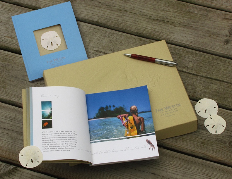 Westin St. Maarten Dawn Beach Residences Sales Kit, winner of the 2007 Pinnacle Print Awards, Best of Category Promotional Campaigns/Consumer. The inside pages feature French folds, while real sand dollars adorn the front cover and a conch shell is embossed on the box, both native to St. Maarten.