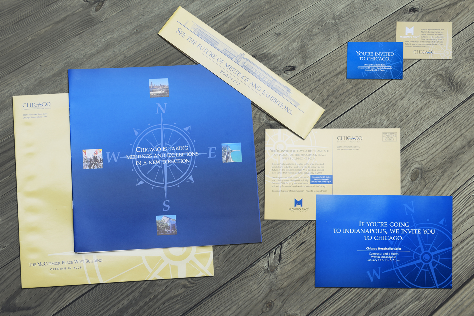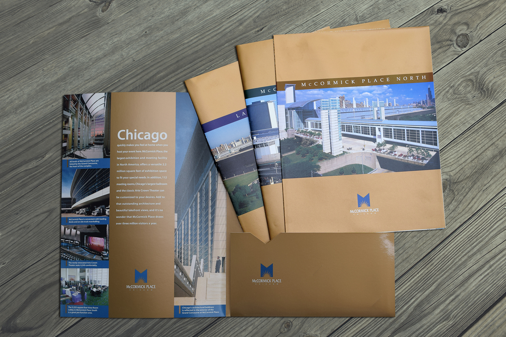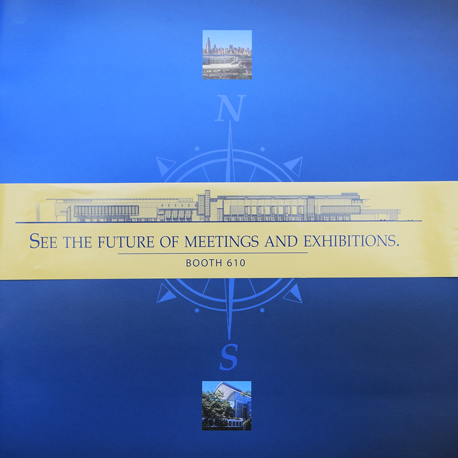 I designed a series of metallic folders and complimenting floor plan brochures to meet the needs of potential trade show event planners. The silver series introduces everything the city has to offer, copper and blue provide more venue details. Eventually, McCormick Place West (left) was introduced.