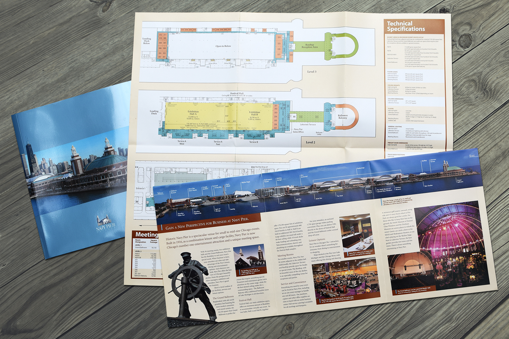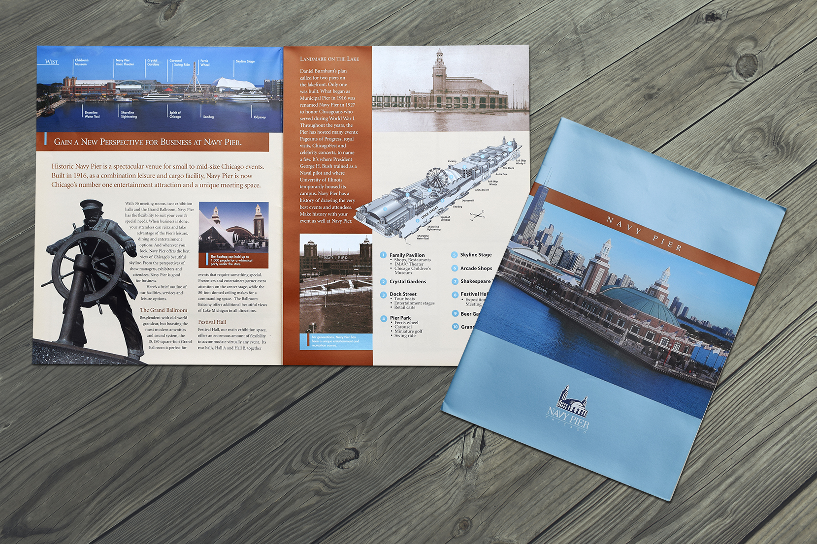 Navy Pier is the oldest venue available for exhibitions with CCTB, having landmark status. This brochure was fun to create, juxtaposing historic photos of the Pier against modern day photos. Upon first opening the brochure, you see the illusion of the newly renovated Pier flowing into the original Pier photographed in 1916.