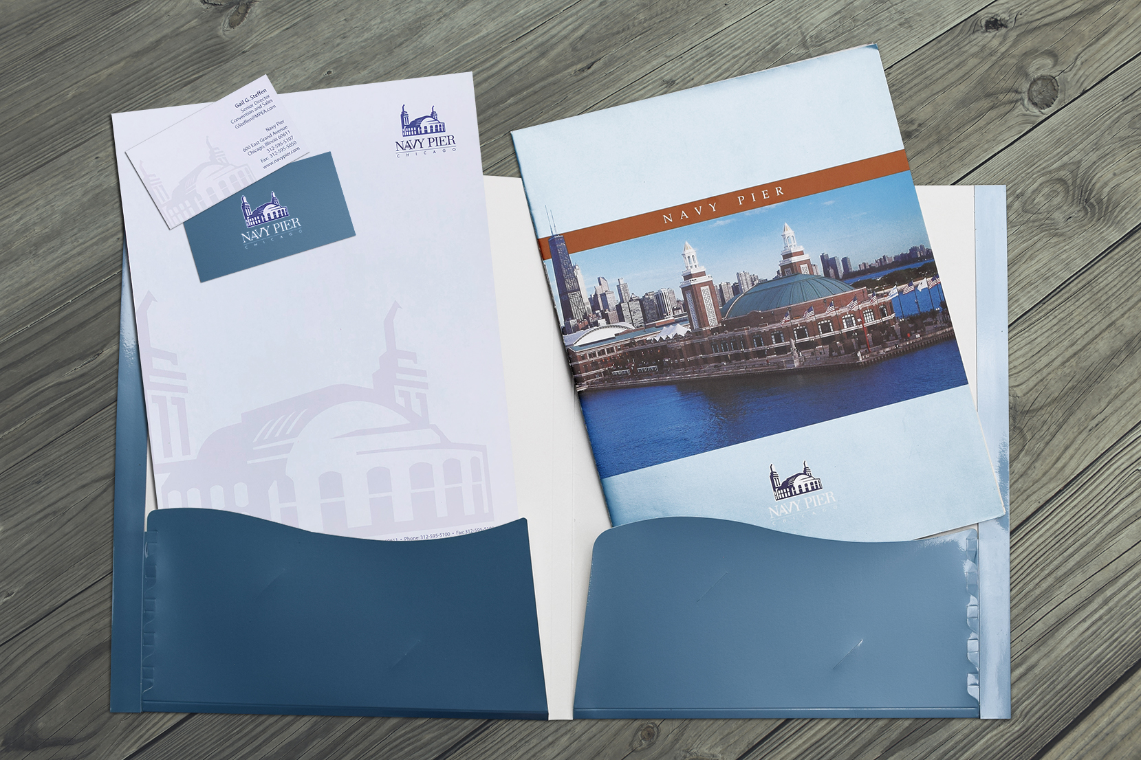 The unique aspect of the Navy Pier folder was the custom die created with the wave cut folders replicating the waves in the A of the logo, paying homage to its location on the lake. Additionally, I designed new identity materials for Navy Pier with watermarked stationary and cards.