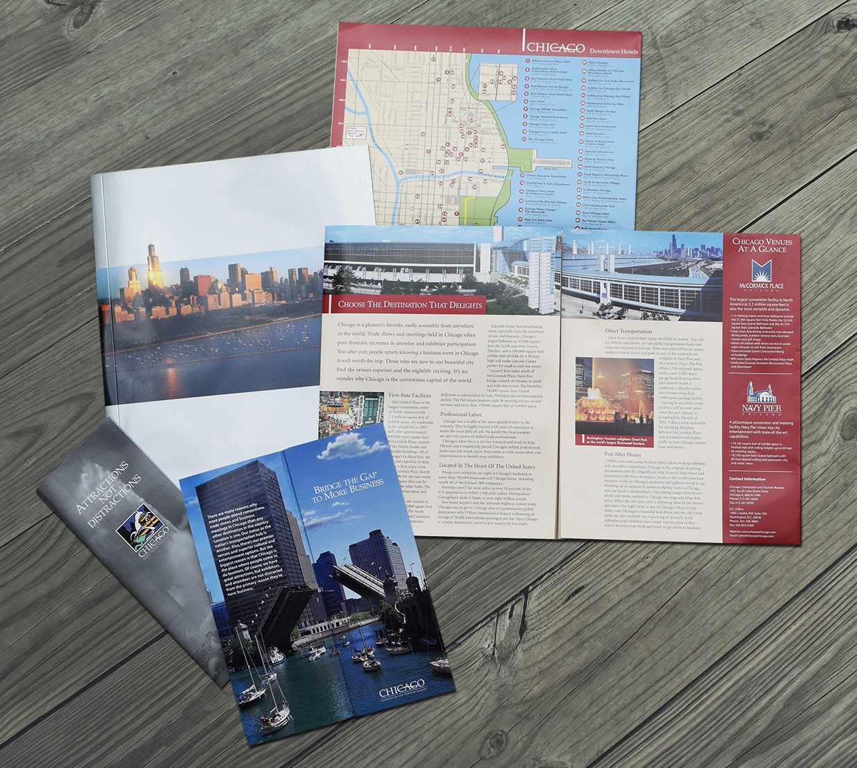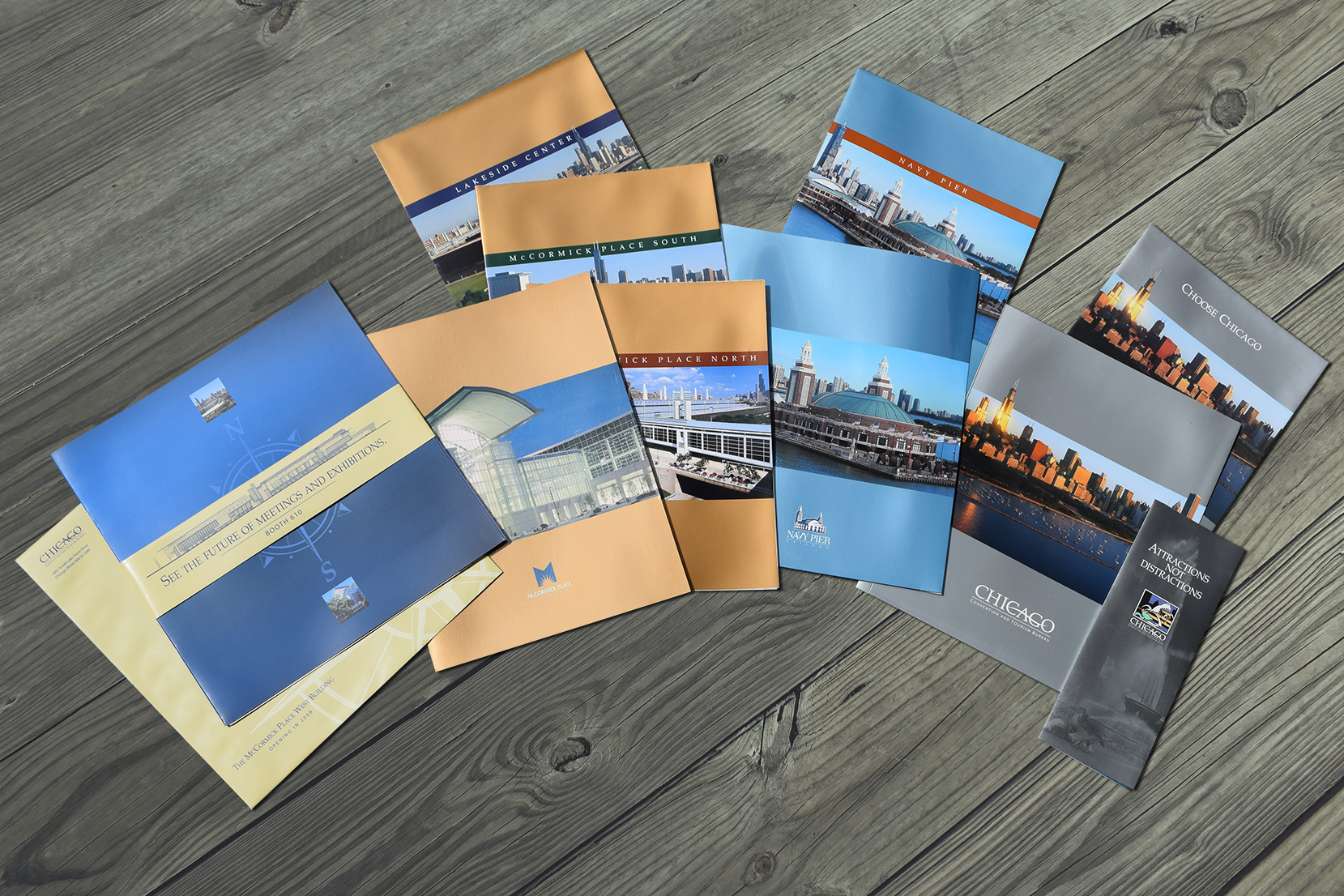 An introduction to the city of Chicago convention venues, the silver folder included the Attractions Not Distractions roll-fold brochure and all-encompassing floor plan brochure.