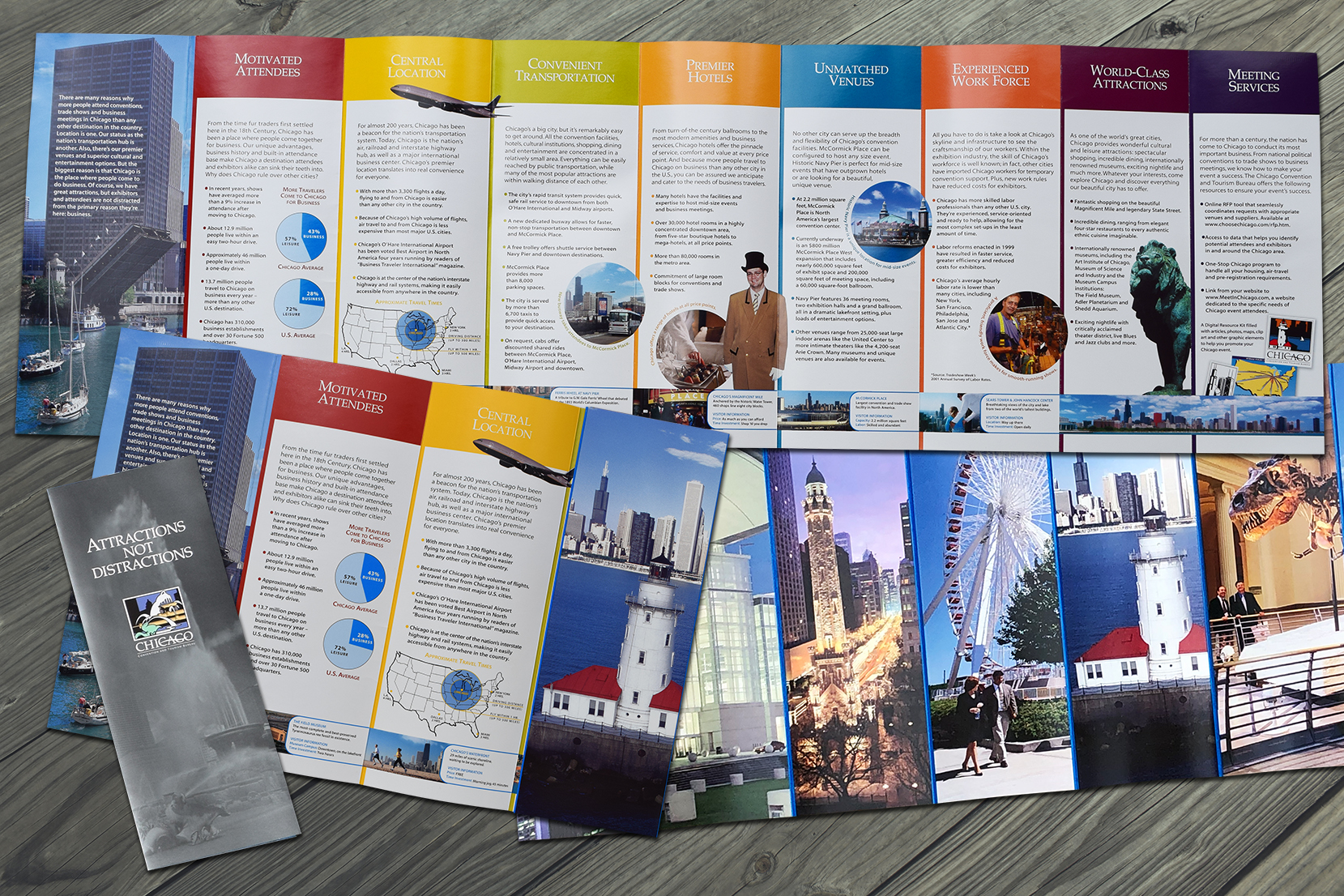 The Attractions Not Distractions brochure was revolutionary for its time, being the largest sheet of paper possible to be created as a roll-fold brochure. Panel by panel, as you open, a new Chicago amenity is featured.