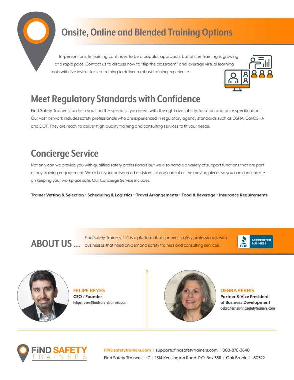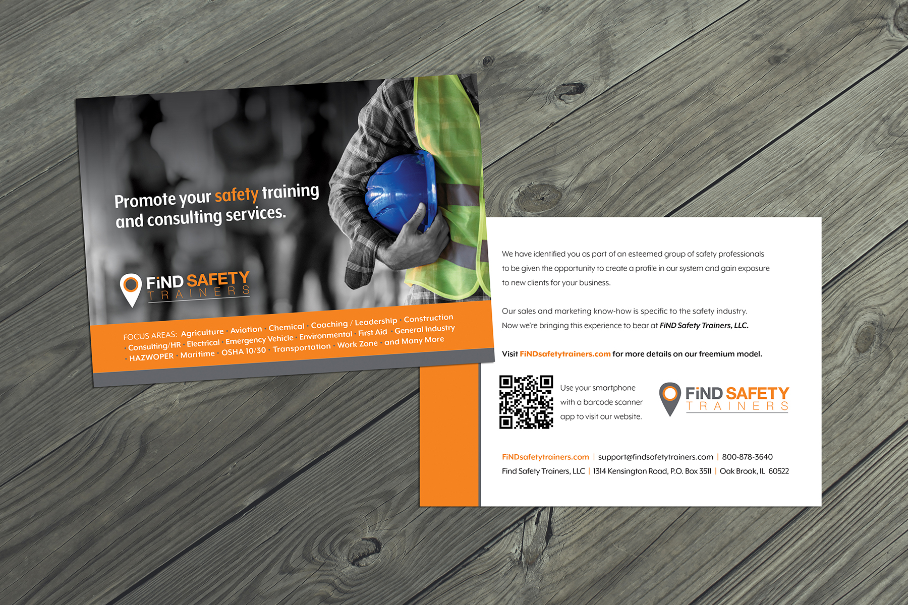 Find Safety Trainers, LLC is a platform that connects safety professionals with businesses that need on-demand safety trainers and consulting services. As a start-up company, they needed a highly identifiable logo that safety professionals could relate to and easily portrayed their product and services. This bold look was carried through their complete identity package.